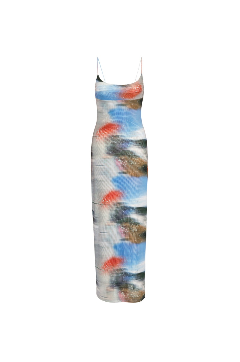 Our Thais Dress is a mesh-lined maxi dress with a sultry side slit, made to accentuate your body in all the right places. Reimagined in our Motion Blue print, she is sure to turn heads. Slip her on (or off) as you please...