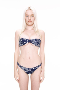 Our bestselling Rio Top is back in Bandana. She's a halter bikini with all-around laced stitch detailing. Size up for more coverage. Miaou's Matte Swim: 85% Nylon, 15% Spandex Freya is 5'9" and wears a size Small. Her measurements are: Bust-33” Waist-24” Hips-34.5”. Hand Wash Cold. Flat Dry in Shade.