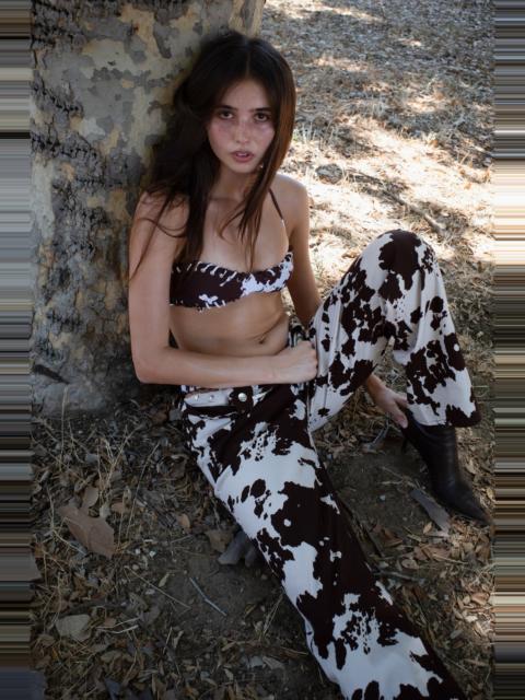 Our bestselling Rio Top is back in Cow Print. She's a halter bikini with all-around laced stitch detailing. Size up for more coverage. Miaou's Matte Swim: 85% Nylon, 15% Spandex Emilia is 5'5" and wears a size XS. Her measurements are: Bust-29” Waist-24” Hips-35.5”. Hand Wash Cold. Flat Dry in Shade.