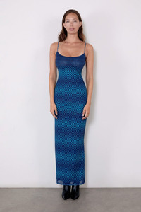 Our Thais Dress is a mesh-lined maxi dress with a sultry side slit, made to accentuate your body in all the right places. Reimagined in Warped Dot Cobalt, she is sure to turn heads. Slip her on (or off) as you please… Miaou's Sculpting Mesh: 94% Recycled Polyester, 6% Spandex Izzy is 5'7" and wears a size S. Dry Clean Only. Do Not Machine Wash.