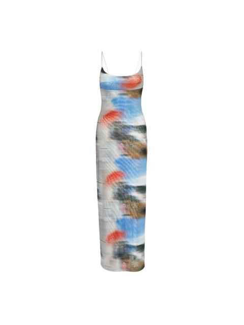 Our Thais Dress is a mesh-lined maxi dress with a sultry side slit, made to accentuate your body in all the right places. Reimagined in our Motion Blue print, she is sure to turn heads. Slip her on (or off) as you please...