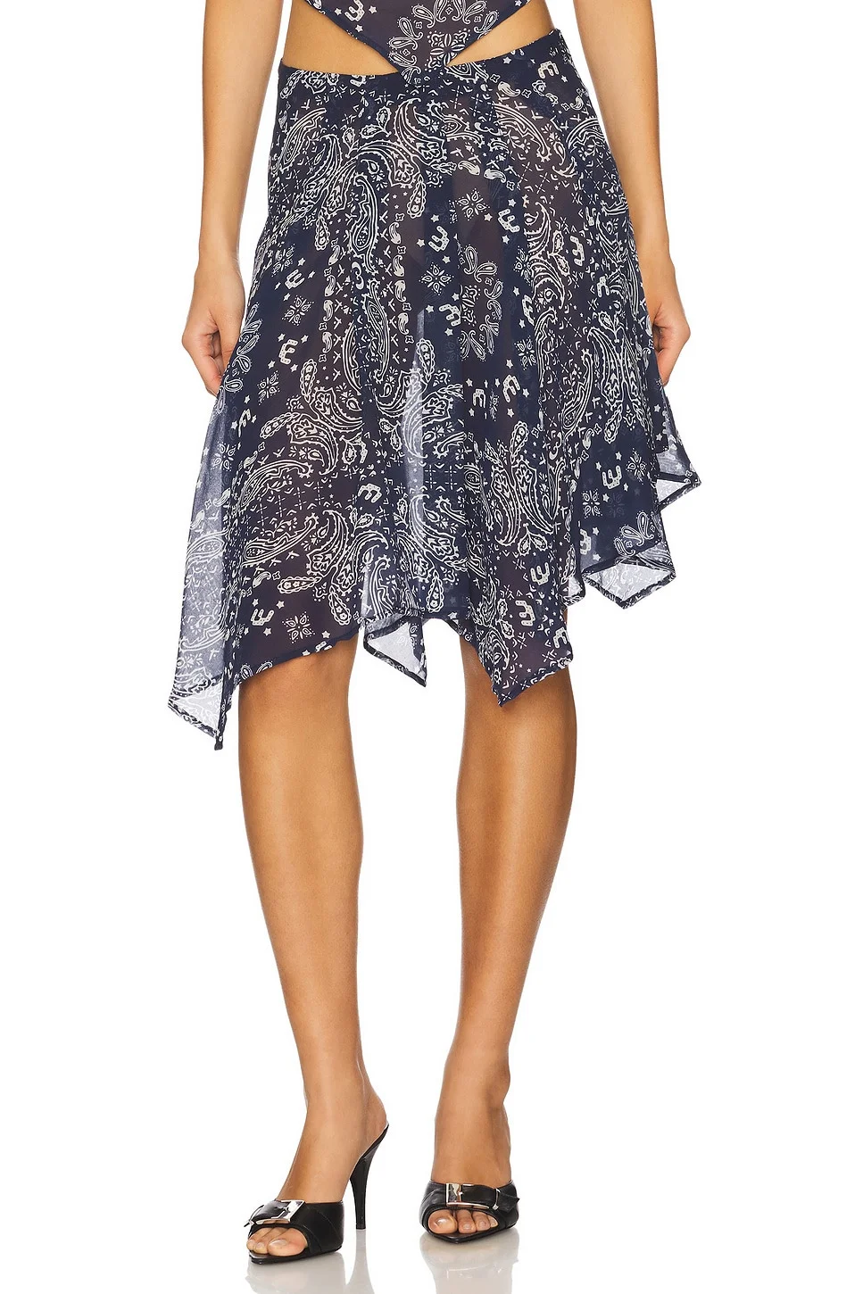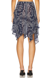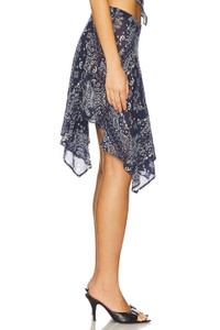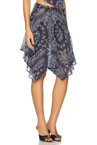 - 95% polyester 5% spandex - Hand wash cold - Unlined - Hidden side zip closure - Asymmetric hem - Lightweight crepe fabric - Garment is intentionally sheer, undergarments will show through - Please note undergarment not included - Waist to shortest hem measures approx 16.5" and to longest hem approx 25.5" in length - Revolve Style No. MAOU-WQ109 - Manufacturer Style No. 4072WSCBNV