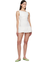 Stretch rayon- and nylon-blend ponte and stretch BCI cotton poplin minidress. · Boatneck · Darts at bust · Gathering at dropped waist · Bubble hem · Low back · Stretch nylon jersey shorts-style lining Supplier color: Creme Body 1: 68% rayon, 28% nylon, 4% spandex. Body 2: 97% cotton, 3% spandex. Lining: 74% nylon, 26% spandex. Made in China 251224F052008