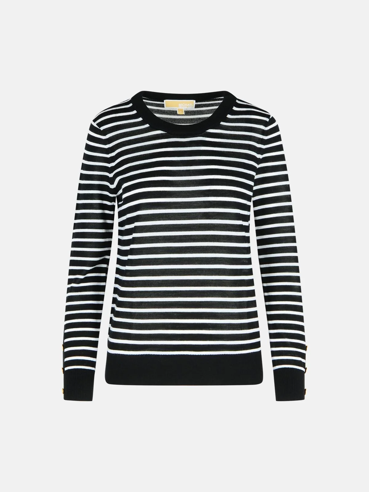 Manufacture code: MT56191HQC 048 Retail code: MT56191HQC 048 Black and white contrast horizontal stripe pattern, ribbed crew neck, fine knit with ribbed finish, button cuffs Main: 100% wool Made in China