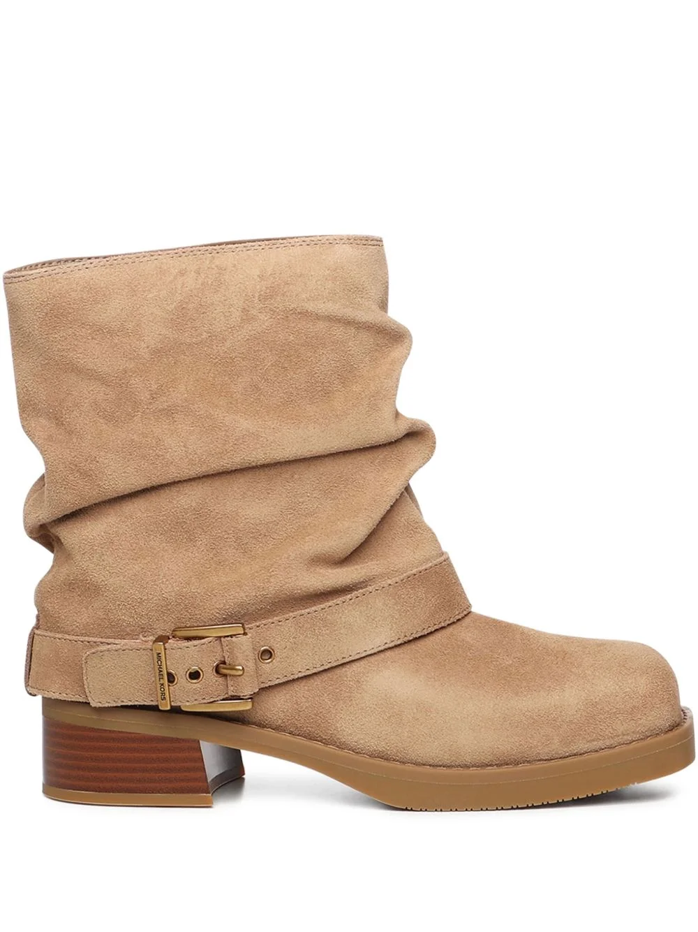 buckled biker boots Highlights - Beige - Buckle detailing - Block heel - Square toe Imported Composition Outer: Calf Suede 100% Lining: Leather 100% Sole: Rubber 100%