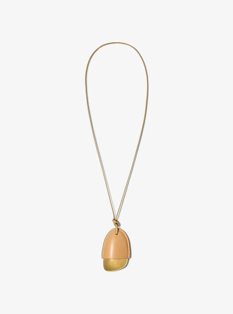 A refined statement piece, this pendant necklace showcases a brushed-brass pendant partially encased in calf leather. Wear it to bring tactile elegance to both day and evening looks. Made in Italy. - Necklace - Brushed brass/leather - 100% leather - Available in: gold-tone hardware - Cord: 15.7” - Made in Italy - Michael Kors jewelry is made of precious metals combined with various elements including semi-precious stones. Apply perfume and cosmetics prior to putting on your jewelry. To clean your jewelry, wipe with the soft buffing cloth provided. Keep your jewelry away from moisture as it promotes tarnish. We recommend storing your jewelry in a clean, dry place, such as the pouch that the product comes in. - Style # 31S6RPDO1N