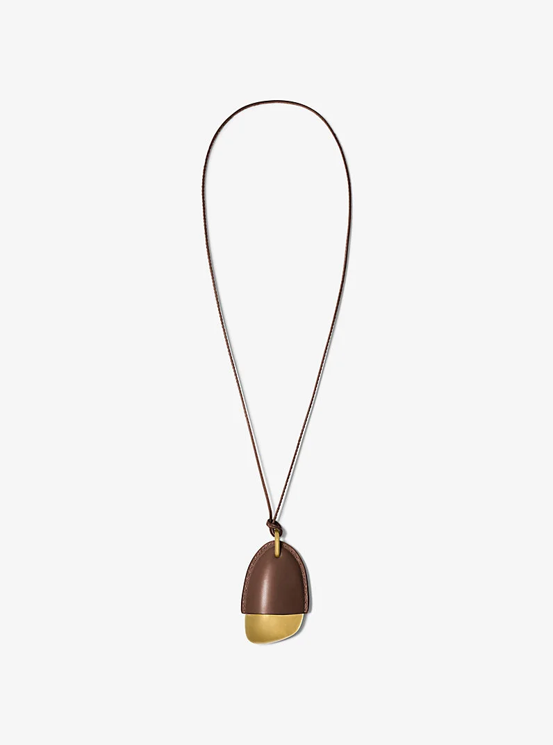 A refined statement piece, this pendant necklace showcases a brushed-brass pendant partially encased in calf leather. Wear it to bring tactile elegance to both day and evening looks. Made in Italy. - Necklace - Brushed brass/leather - 100% leather - Available in: gold-tone hardware - Cord: 15.7” - Made in Italy - Michael Kors jewelry is made of precious metals combined with various elements including semi-precious stones. Apply perfume and cosmetics prior to putting on your jewelry. To clean your jewelry, wipe with the soft buffing cloth provided. Keep your jewelry away from moisture as it promotes tarnish. We recommend storing your jewelry in a clean, dry place, such as the pouch that the product comes in. - Style # 31S6RPDO1N