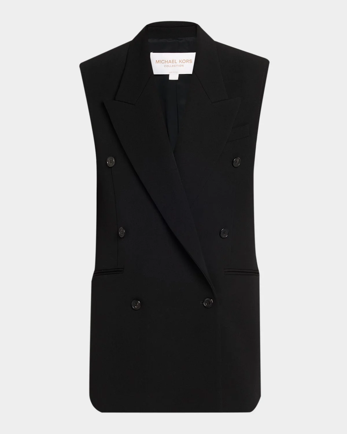 This MICHAEL Michael Kors straight vest is crafted in wool gabardine with artfully & nbsp;frayed edges on the armholes Peak lapels; double-breasted front Sleeveless Chest welt pocket Hip welt pockets Center back vent Straight silhouette Virgin wool Dry clean Made in Italy