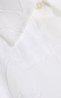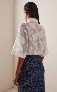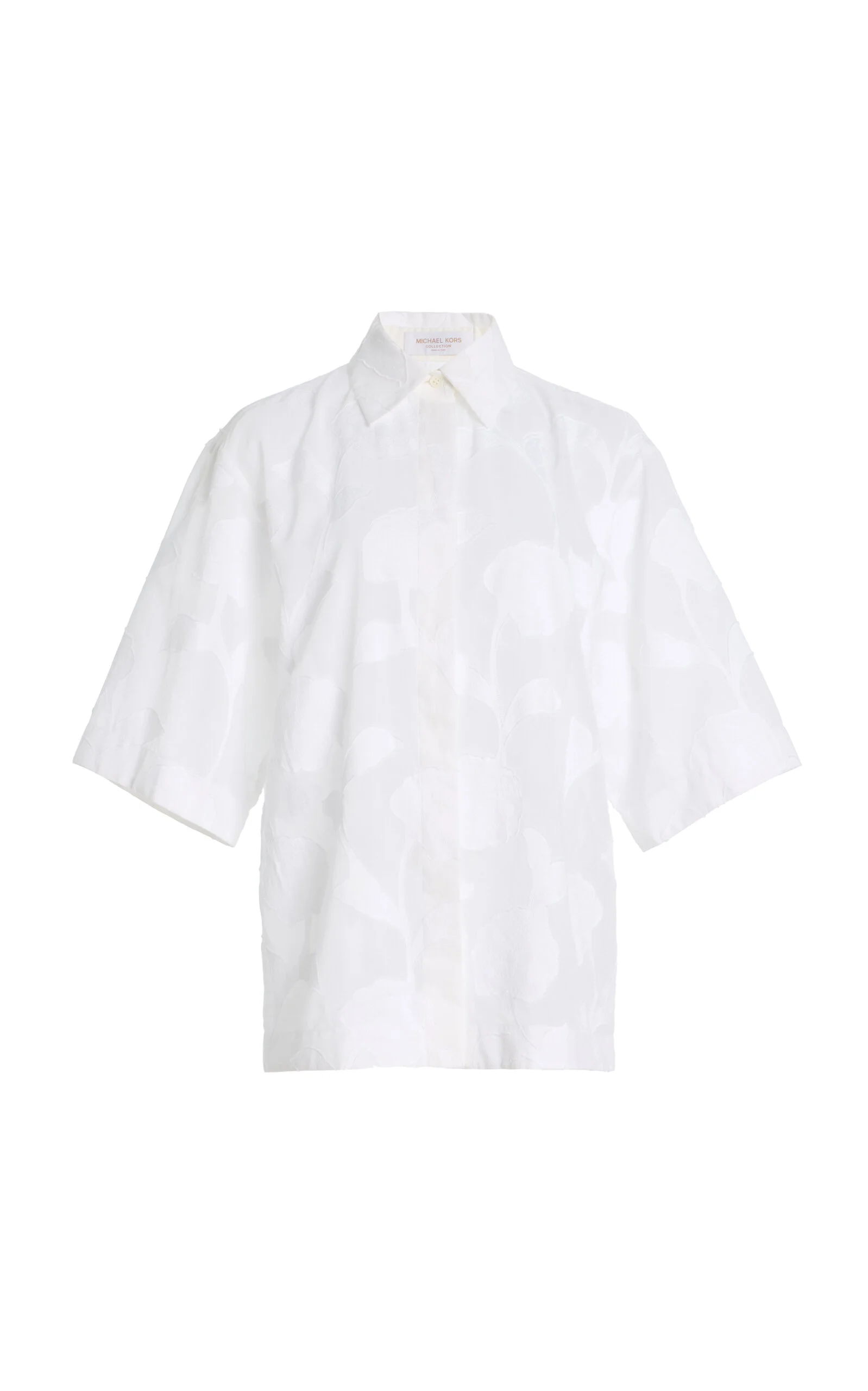 A master of contemporary American sportswear, designer Michael Kors is renowned for his clean lines and timeless silhouettes that celebrate the feminine form. This collared shirt has a boxy fit made from sheer floral-patterned fil coupe. PRODUCT DETAILS - Resort '26 - Button fastening - Composition: floral fil coupe - Designer color: Optic White - Dry clean - Made in Italy SIZE & FIT - Our model is wearing a size Small - Model is 5’10” with a 30” bust, 24” waist, and 34” hip