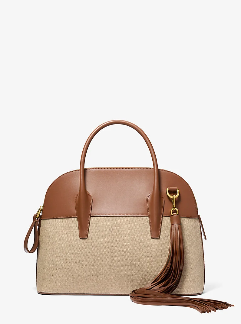 Made in Italy from a luxurious blend of linen and smooth leather, the refined Kaitlin dome satchel returns for Spring/Summer 2026. Complete with sophisticated top handles and a detachable fringed tassel, the zip-fastened design opens to a pocketed interior sized to hold all the essentials. Take a cue from the runway and let its elegant architectural sensibility complement tailored separates and knits alike. - Satchel - Linen/leather - Fabric 1: 100% linen - Fabric 2: 100% leather - Antique gold-tone hardware - 15.4"W X 11.4"H X 5.1"D - Handle drop: 4.5" - Lining: 100% suede - Zip fastening - Dust bag included - Made in Italy - Style # 31S6RKNS4E
