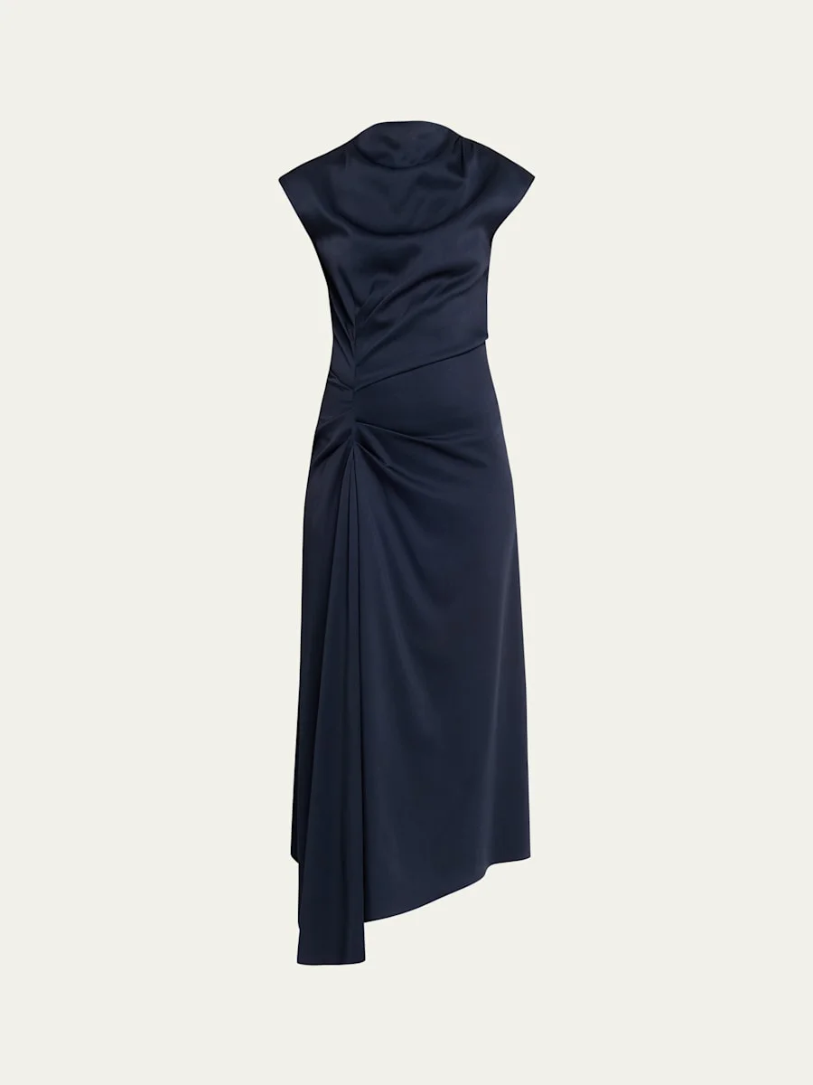 This Michael Kors Collection midi dress is cut from a fluid acetateviscose fabric, adorned with wide waist pleats and a side drape High neckline Cap sleeves Hem falls below the knee Aline silhouette Invisible back zipper Acetate/viscose Dry clean Made in Italy