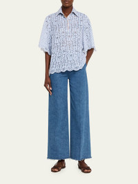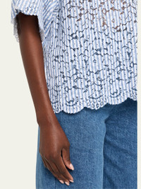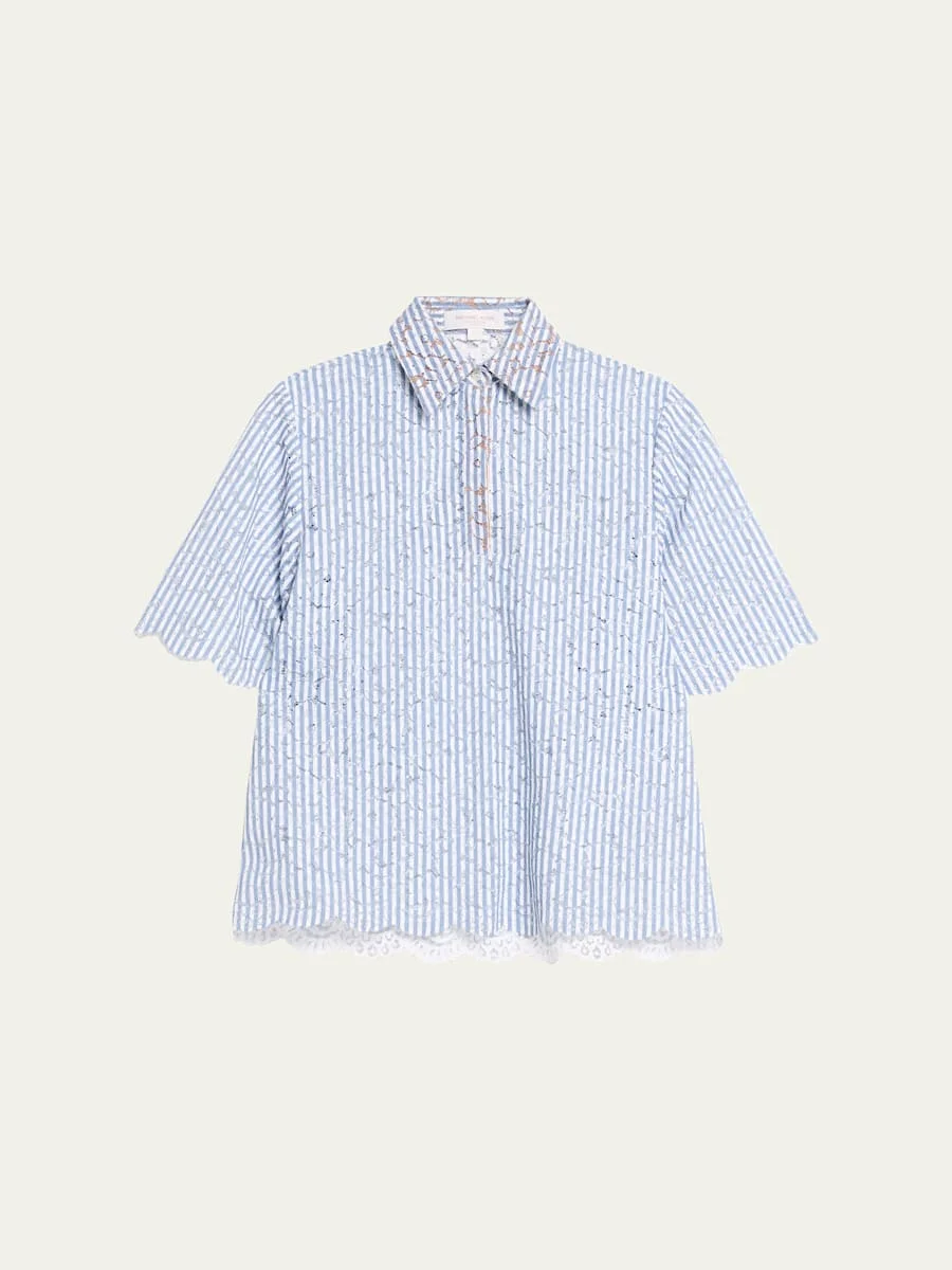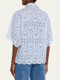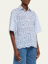 This Michael Kors Collection shirt is designed in intricate floral lace with printed vertical stripes and scalloped edges Point collar Concealed button front Elbow sleeves Relaxed fit Nylon/polyamide/elastane Dry clean Imported