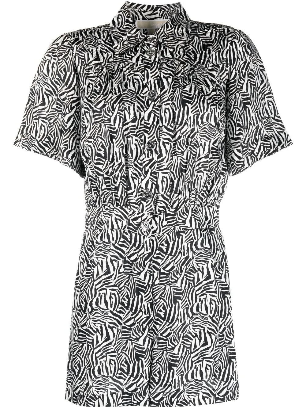 graphic-print short-sleeve playsuit white/black recycled polyamide blend/silk blend zebra print pleat detailing classic collar short sleeves elasticated waistband front button fastening straight hem Imported Composition Outer: Silk 52%, Viscose 48% Lining: Recycled Polyester 55%, Polyester 45% Washing instructions Dry Clean Only