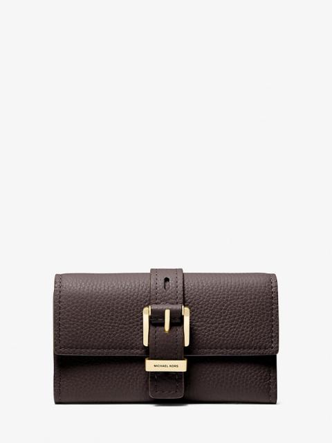 The Nolita wallet is an instant favorite in rich pebbled leather with a stylish buckle detail. The tri-fold design offers ample space for your cards, cash, and receipts. Toss it into your tote or carry it in hand as a clutch. - 100% of the leather in this product comes from tanneries receiving Leather Working Group Gold- or Silver-certification in recognition of their environmental performance. - 100% leather from tanneries meeting the highest standards of environmental performance - Wallet - Pebbled leather - 100% leather - Gold-tone hardware - 5.75"W X 3.75"H X 1"D - Interior details: back zip pocket, center zip and slip pockets, 5 card slots - Lining: 55% polyester/45% linen - Snap fastening - Imported - Style # 32F4GY5E8L