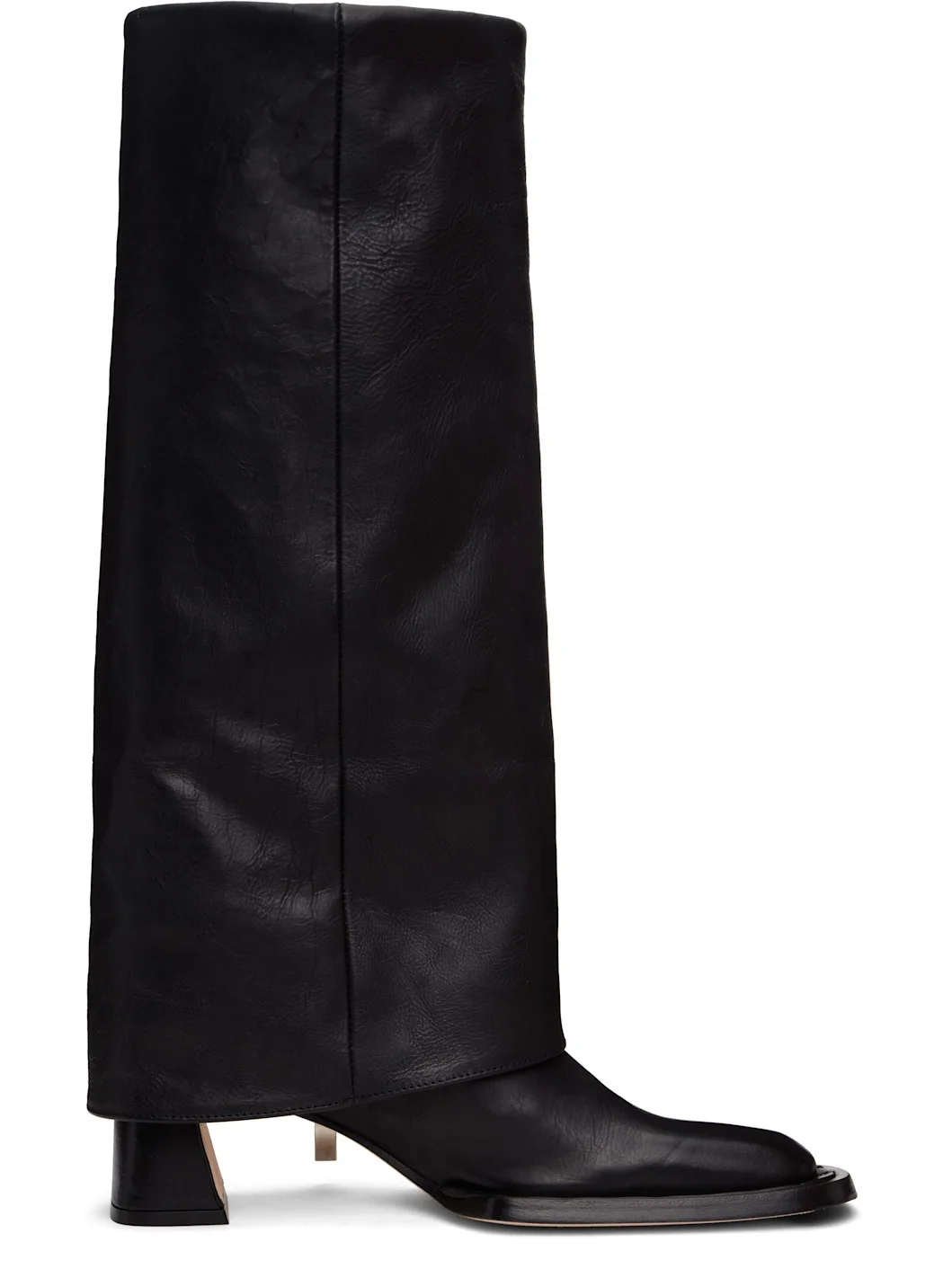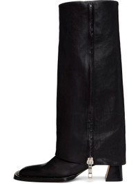 Knee-high grained leather boots in black. · Square toe · Foldover collar · Zip closure at inner side · Studs at welt · Covered block heel · Suede sole with rubber injection · Silver-tone hardware · Heel: H2.25" Supplier color: Black Upper: leather. Sole: leather, rubber. Made in Spain 242877F115017