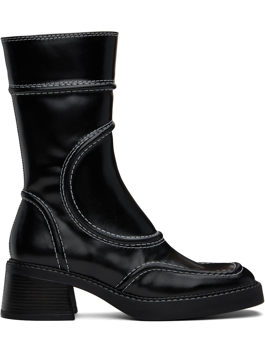 Mid-calf buffed leather boots in black. · Piping throughout · Square toe · Concealed elasticized gusset at collar · Zip closure at inner side · Grained faux-leather lining · Serrated edge at welt · Stacked leather block heel with rubber injection · Treaded rubber sole · Contrast stitching in white · Heel: H2" Supplier color: Black