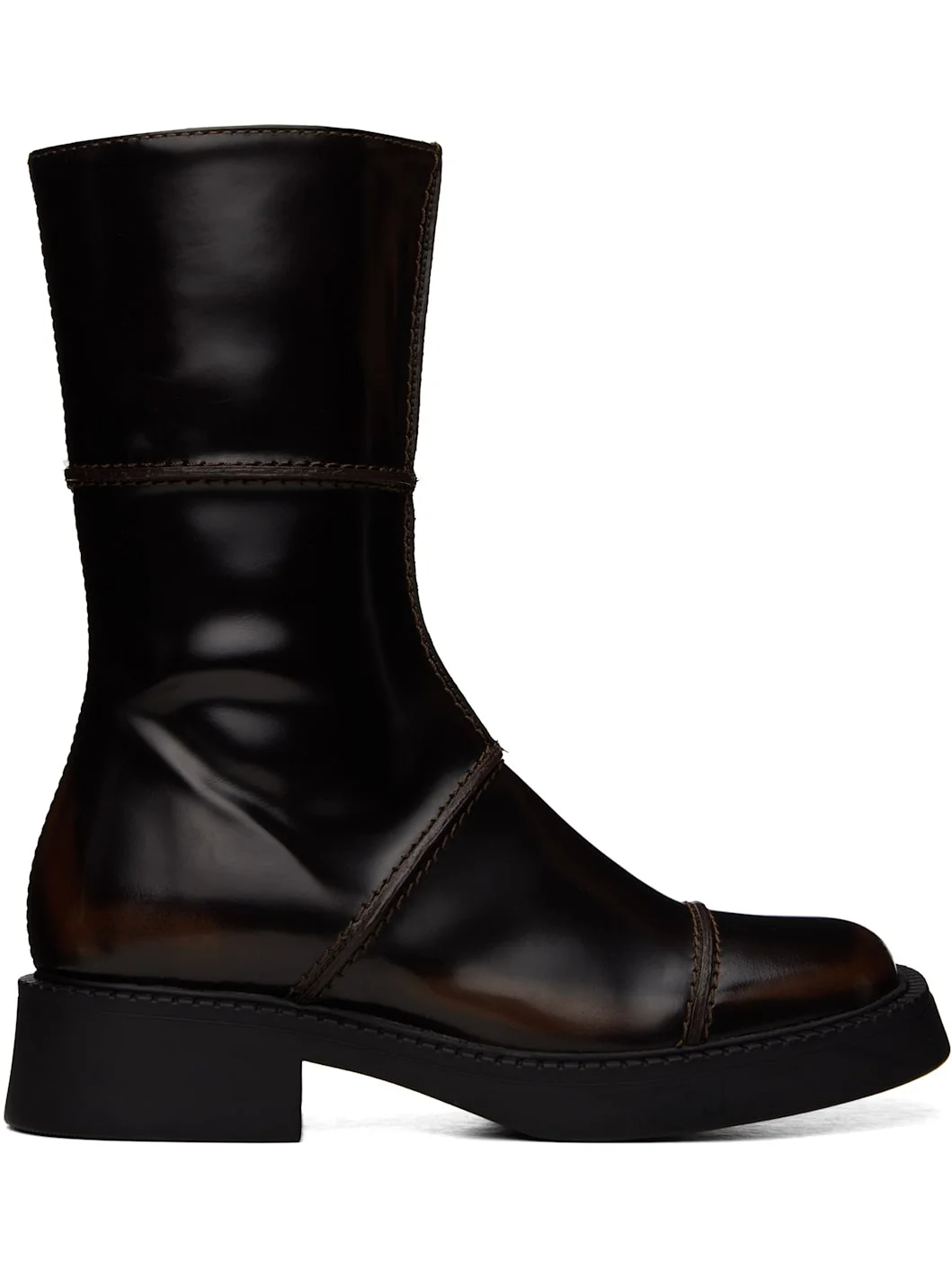 Mid-calf polished leather boots in brown. · Pinched seams and hand-brushed fading throughout · Square toe · Concealed elasticized gusset at back collar · Zip closure at inner side · Grained faux-leather lining · Rubber block heel · Serrated detailing at welt · Treaded rubber sole · Heel: H1.75" Supplier color: Dark brown