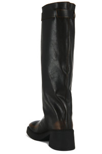 - Leather upper with manmade sole - Pull-on styling - Leather footbed and lining - Buckled strap with silver-tone studded trim - Rounded square toe with block heel - Approx 50mm/ 2 inch heel Approx 381mm/ 15 inch shaft Opening measures approx 15.7" in circumference - Revolve Style No. MIIT-WZ35 - Manufacturer Style No. E8_3995