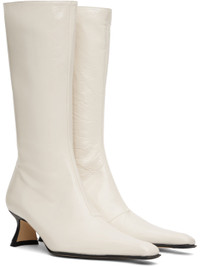 Calf-high polished crinkled leather boots in white. · Pointed square toe · Zip closure at inner side · Concealed elasticized gusset at inner collar · Grained leather lining · Covered heel with rubber injection · Nubuck sole with rubber injection · Heel: H2.25" Supplier color: Off-white Upper: leather. Sole: leather, rubber. Made in Spain 242877F114019