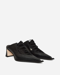 Miista Sherri Mules Black Sherri is a high-fronted mule in black leather with a pointed toe, outsized beak-shaped sole and a slim sculpted 6 cm heel. The design features a lingerie-inspired lattice of elasticated lacing down the front of the shoe to the toes. - Leather Upper - Vegetable Tan Cow Leather Lining - Ultra-Cushioned Memory Foam Inner Sole - Rubber-Invected Toe - Leather Sole - Heel Height: 6 cm - Style Code: MI-5896 Black