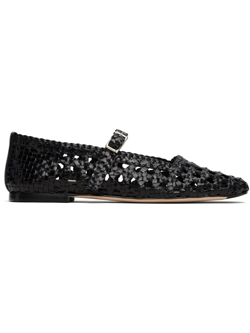 Hand-woven grained leather Mary Jane-style ballerina flats. · Square toe · Elasticized pin-buckle strap at vamp · Logo patch at padded footbed · Unlined · Leather sole with rubber injections Supplier color: Black Upper: leather. Sole: leather, rubber. Made in Spain 251877F118005