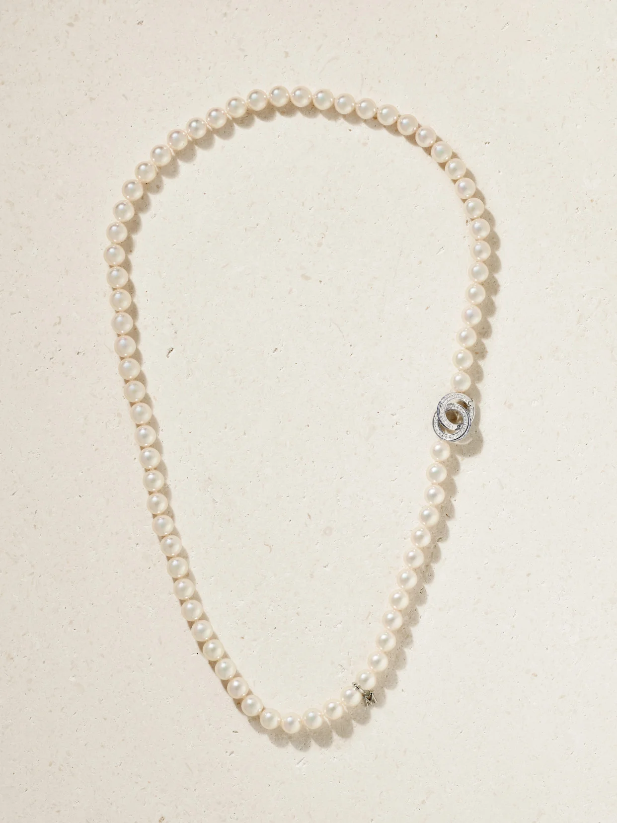 Crafted from 18-karat white gold, MIKIMOTO's necklace is strung with the brand's signature Akoya pearls. The clasp fastening is inlaid with sparkling sapphires and diamonds - make it the focus by wearing it at the front.