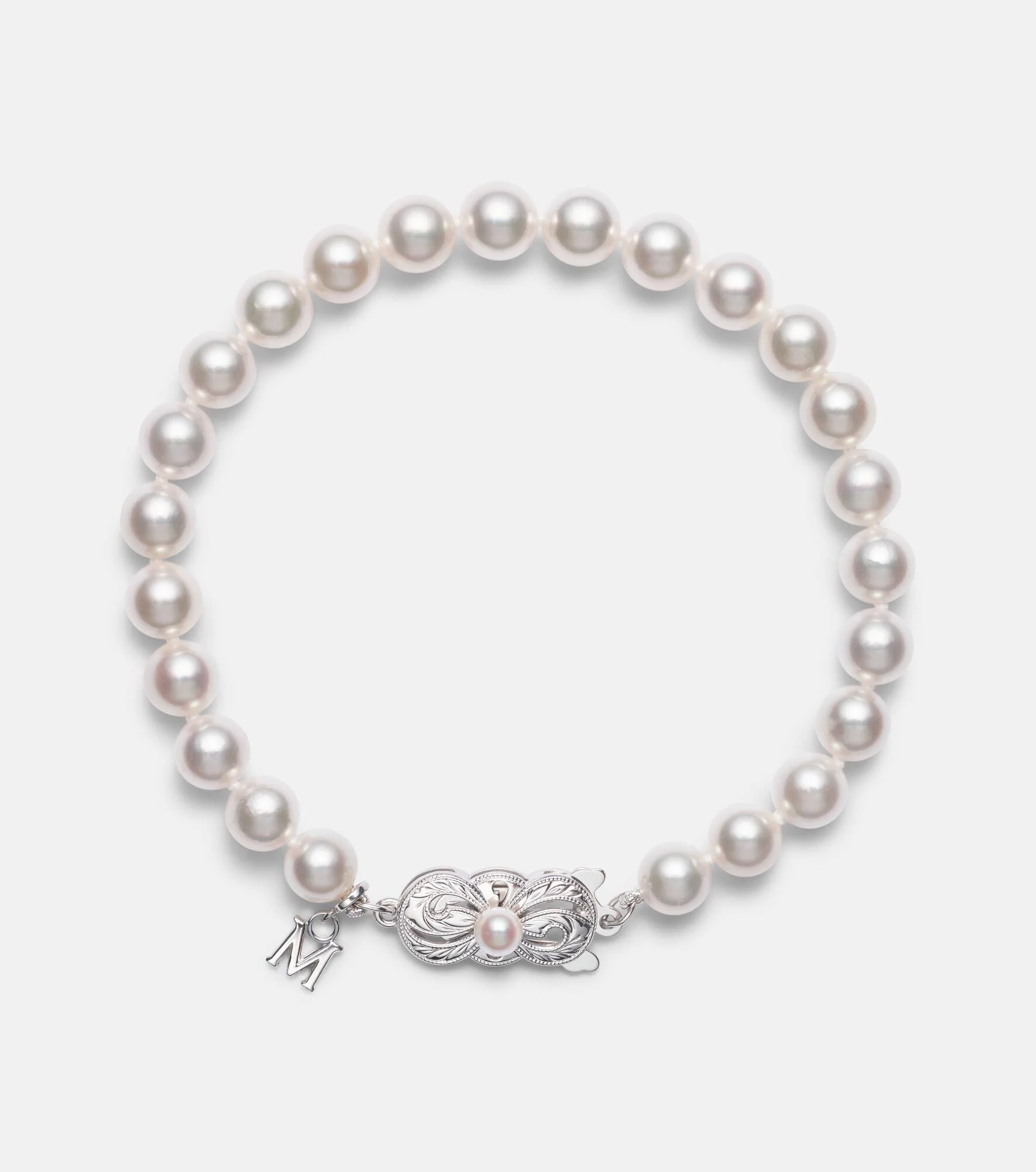 Balancing traditional Japanese metalwork and European manufacturing techniques, Mikimoto's sophisticated treasures are designed to spotlight your inner radiance. Featuring a row of exquisite Akoya pearls, this 18kt white gold bracelet is enriched with a decorated ribbon clasp and an M charm for a signature finish. Product Details - Material: 18kt white gold (750/1000) - Made in the USA - Item color: white gold, white - Color: silver - Pearl I: Akoya cultivated - Closure: clasp fastening - Item number: P01103399 Size & Fit - Width 6mm-0.25" - Max. width 7mm-0.3" - Circumference 16cm-6.5"