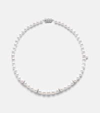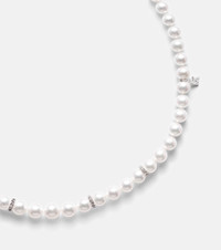 Balancing traditional Japanese metalwork and European manufacturing techniques, Mikimoto's sophisticated treasures are designed to spotlight your inner radiance. This necklace is carefully crafted from 18kt white gold and features exquisite Akoya pearls. Accentuated by rondelles with dazzling diamonds, the creation pairs well with elegant everyday looks, glamorous special occasion ensembles, and everything in between. Product Details - Material: 18kt white gold (750/1000) - Made in the USA - Item color: white gold, white - Color: silver - Stone I: 49 diamonds, 0.84ctw - Pearl I: Akoya cultivated - Closure: clasp fastening - This piece features natural diamonds only - Item number: P01103397 Size & Fit - Length when open 47cm-18.5" - Min. width 6mm-0.25" - Max. width 9mm-0.35"