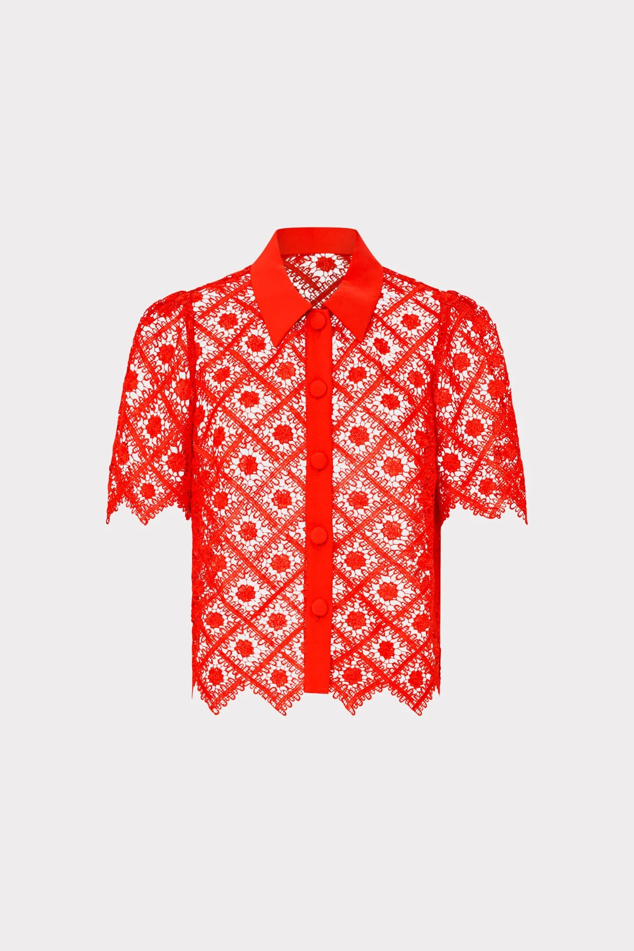 Rendered from stunning embroidered tile lace, this boxy button-up collared top pairs perfectly with any MILLY shorts or pant this season. Its pleated shoulder creates a subtle puff sleeve that is left unfinished, with a raw-edged, uneven hem. It has covered buttons to close. PRODUCT DETAILS - Puff sleeve - Short sleeved - All over lace - Button up - White buttons - Knit collar - Fabric: 100% Polyester Style Number: 83ST53 CARE INFORMATION Dry Clean Only SIZE + FIT Size: Runs true to size. Fit: Boxy fit Model info: Model is wearing a size Small and is 5'10", Bust: 33", Waist: 24", Hips: 37"