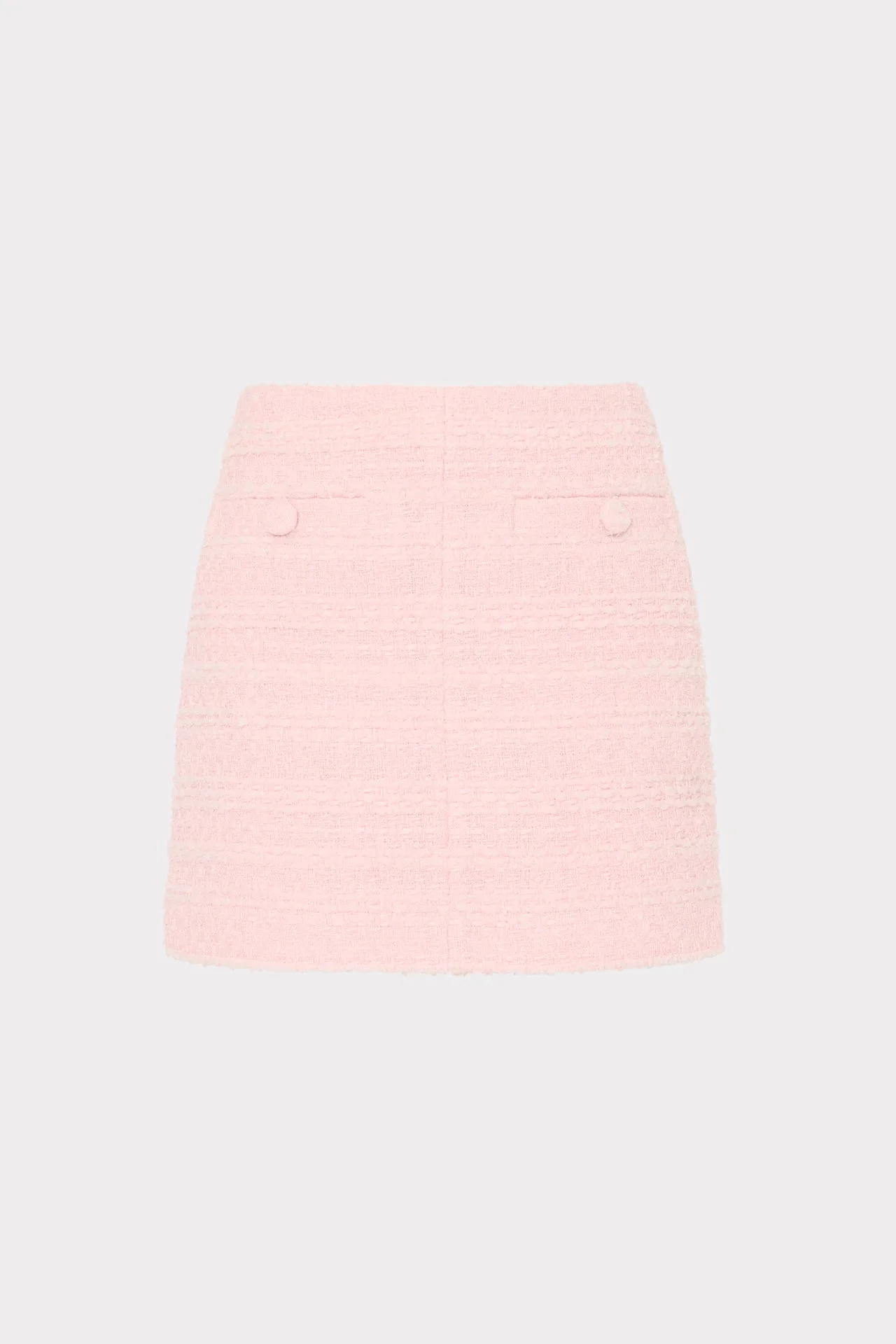 Cut from a lightweight tweed fabric, this mini skirt is accented with buttons on each pocket. For the full look, wear it with its coordinating Bryn Tweed Top. PRODUCT DETAILS - Mini skirt - Tweed - Lined - Buttons over the pockets on skirt - Fabric: 95% Polyester, 5% Spandex Style Number: 81US76 CARE INFORMATION Spot Clean Only SIZE + FIT Size: Runs true to size Fit: Form Fitting Model info: Model is wearing a size 2 and is 5'10", Bust: 32", Waist: 24", Hips: 34" Measurements: Approx 15" in length