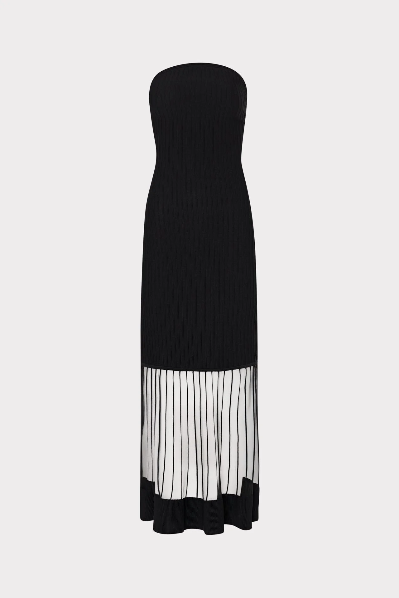 Our luxe signature knit fabric gets an evening wear update with a sheer, pleated chiffon overlay that hits at a midi length. Versatile, comfortable, and easy to wear with nothing but a pair of black heels. Perfect for cocktails, parties, weddings, and nights out. PRODUCT DETAILS - Knit midi dress - Off the shoulder - Strapless - Ribbed knit fabrication - Sheer skirt - Pull on - Fabric: 50% Viscose, 48% Nylon, 2% Polyester Style Number: KUD677 CARE INFORMATION Dry Clean Only SIZE + FIT Size: Runs large due to nature of fabric Fit: Form Fitting Model info: Model is wearing a size Small and is 5'10", Bust: 33", Waist: 24", Hips: 37" Measurements: Approx. 41” in length from shoulder to hem