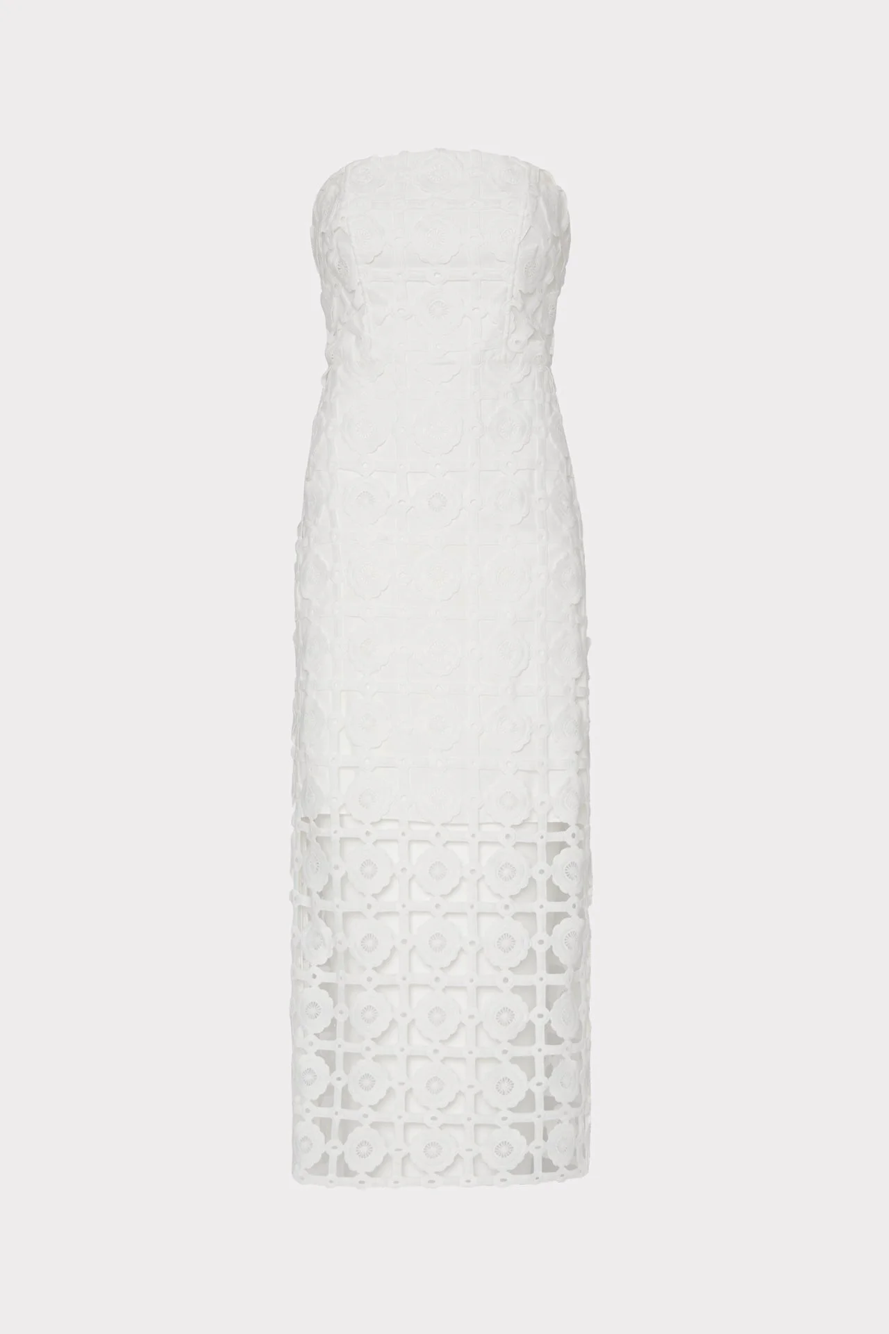For your next exclusive party, bring the glamour with our strapless Kait dress. This ankle length dress features an artisanal, textured tile pattern that serves as an overlay to reveal bare legs past the knee. It has a boned-in bodice for shape and a chic, straight silhouette. Style yours with an ultra high heel. For other similar pieces to the white Kait Tile Lace Dress, check out Milly's curated dresses collection. PRODUCT DETAILS - Midi Length - Strapless - Lined to Mid-thigh - Textured Tile Pattern - Boning in bodice - Elastic Support Band at bodice - Back Zip - Back Slit - Fabric: 100% Polyester Style Number: 67ND72 CARE INFORMATION Dry Clean Only SIZE + FIT Size: Runs true to size. Fit: Form Fitting, fabric has no stretch. Measurements: Approx. 47” in length from shoulder to hem size 4 Model info: Model is 5’10 and is wearing a size 4