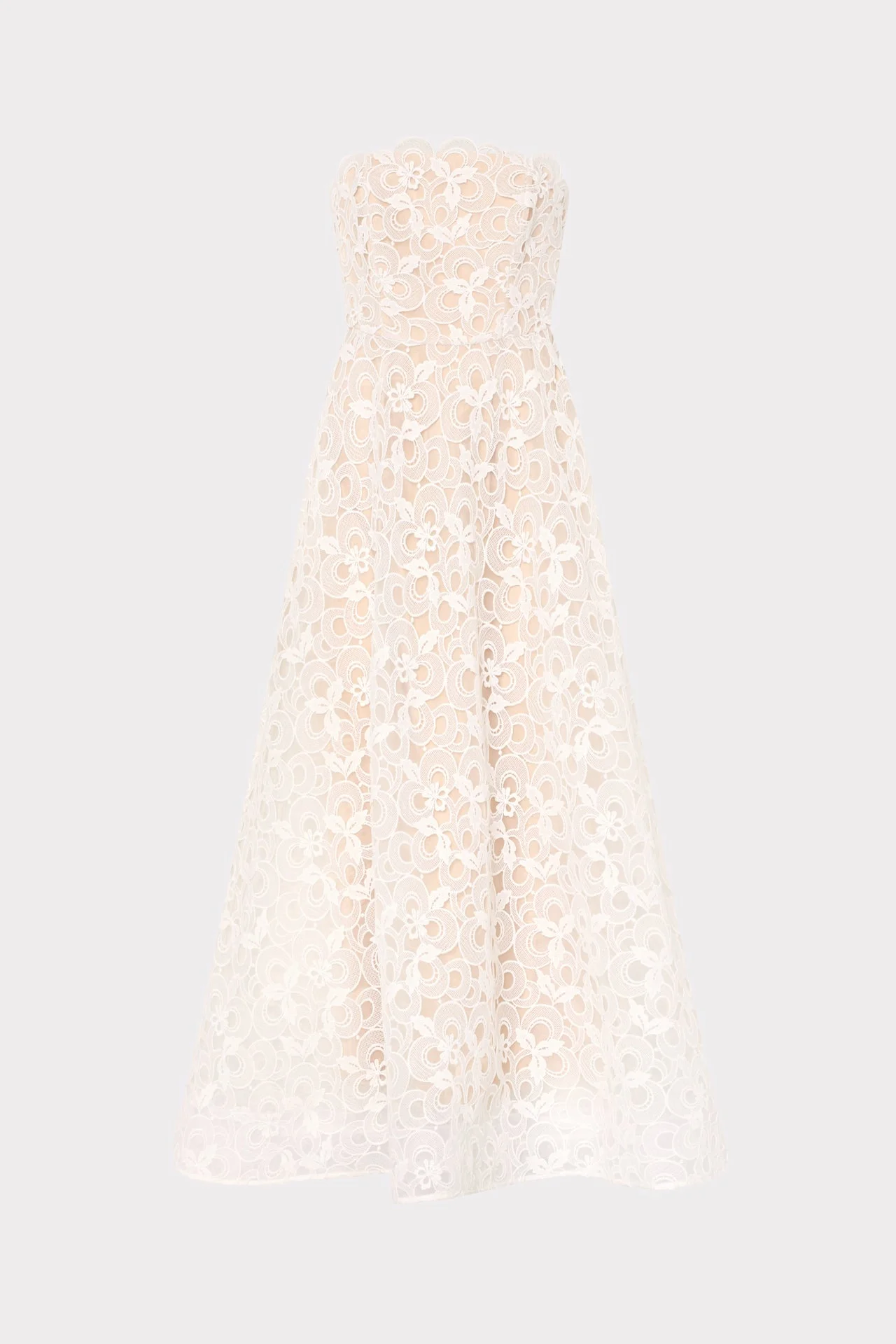 This supremely feminine strapless bridal gown is embroidered with curled lace atop a mesh overlay. It has a full, Audrey Hepburn-style skirt with a volumizing tulle underlay that falls to an elegant tea length. It also features an interior elastic support band with a bra hook closure and boning at the bodice for shape and support. It’s perfect for brides who want to bring a mix of traditional and modern to their special day. PRODUCT DETAILS - Tea length bridal gown - Strapless - Embroidered curled lace on mesh overlay - Full skirt with tulle underlay - Back zipper closure - Elastic support band with bra hook closure at bust - Boning in bust - Nude lining - Fabric: 100% Polyester Style Number: 97UD33 CARE INFORMATION Dry Clean Only SIZE + FIT Size: Runs true to size. Fit: Fitted Model info: Model is wearing a size 2 and is 5'10", Bust: 32", Waist: 24", Hips: 34" Measurements: Approx. 45” in length from shoulder to hem size 4