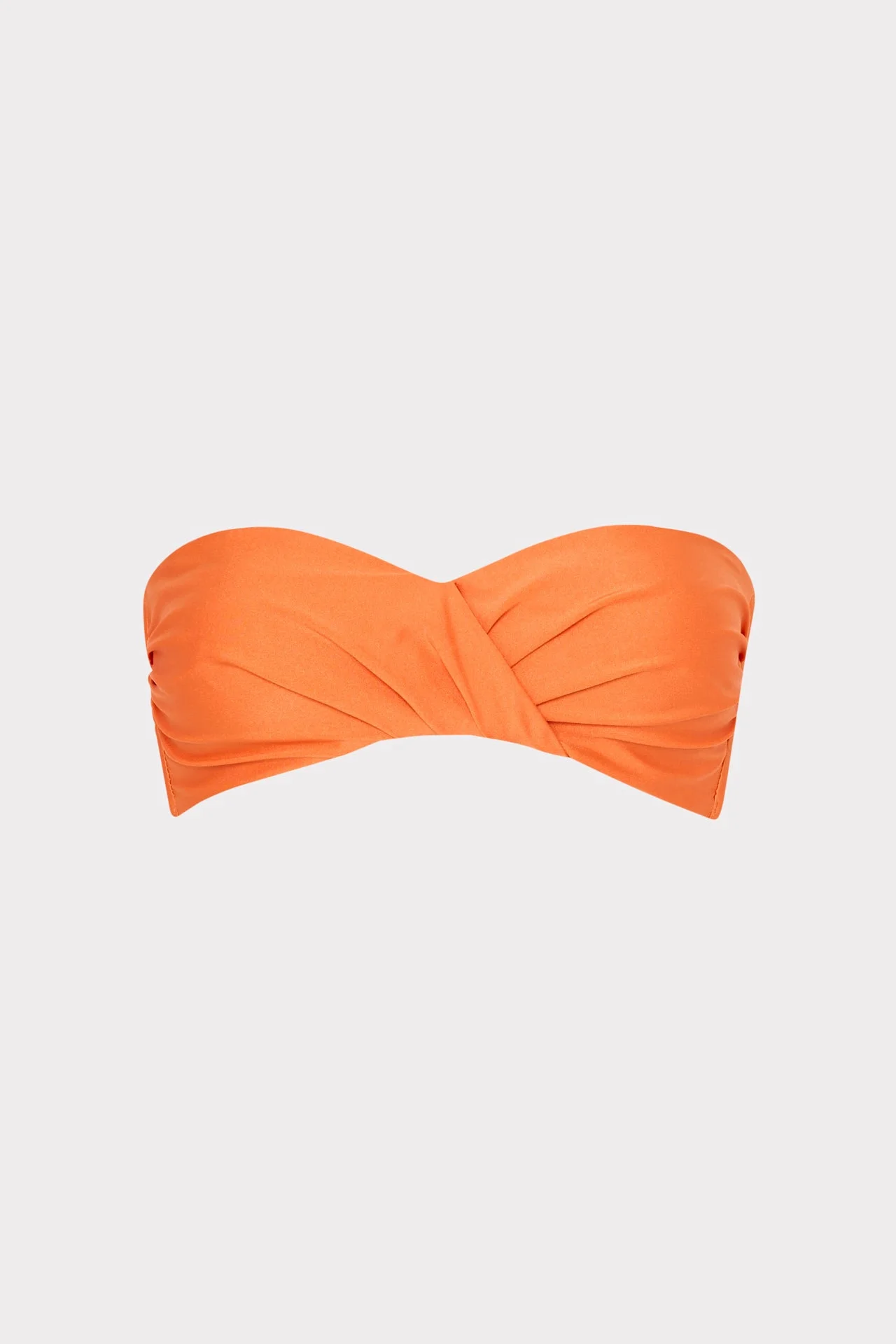 Made from luxe sustainable Italian swim fabric, this bandeau style bikini top has a twist detail at its center. It’s lined for extra coverage and is finished with a clasp detail in the back. Wear it with its coordinating Solid Margot Bikini Bottom in orange and your favorite MILLY sarong. PRODUCT DETAILS - Bandeau bikini top - Twist detail - Clasp closure at back - Removable cups - Removable straps - Lined - Fabric: 82% Polyamide, 18% Elastane Style Number: 38KX74 CARE INFORMATION Hand Wash Cold, Lay Flat to Dry SIZE + FIT Fit: True to size, we suggest purchasing your normal size. Model info: Model is wearing a size Small and is 5'9", Bust: 32", Waist: 25", Hips: 35"
