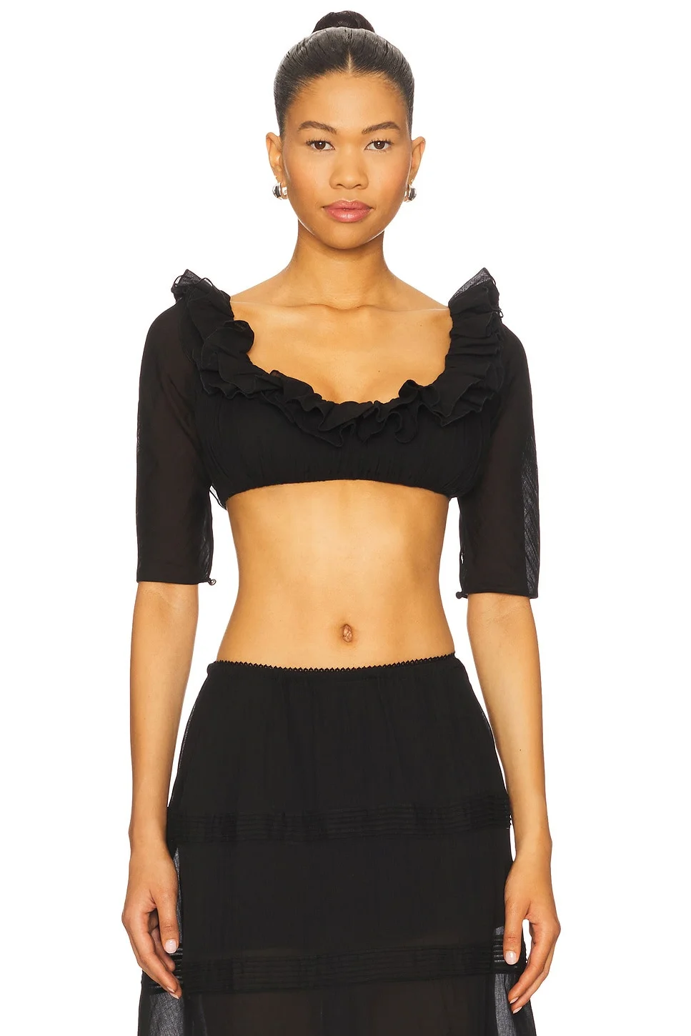 - 100% cotton - Dry clean only - Back hook and eye clasp closures - Elasticized stretch at back - Ruffle detail at neckline - Cropped fit - Poplin fabric - Item not sold as a set - Revolve Style No. MPAL-WS23 - Manufacturer Style No. MP3064