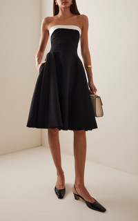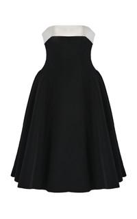 Queens native Marcelo Gaia continues to flex his expertise in sultry, body-skimming seduction with his signature fluid glamour and tantalizing jolts of old-world, Italian-gothic romance. Strapless lady length dress with two interchangeable fold over collars in noir velvet and pearl silk. Can also be worn without either collar. Silicone gripper elastic at the top edge of the inner bodice. Godets at high hip with built in pockets. Invisible zipper and hook and eye on center back. Boning on the side seam and side back. PRODUCT DETAILS - Resort '25 - Zip fastening - Composition: 100% silk; Combo: velvet, Lining: 100% silk - Designer color: Black/Pearl - Dry clean - Imported SIZE & FIT - Our model is wearing a size Small - Model is 5'11" with a 32" bust, 25" waist, and 35.5" hip - Designed for a slim fit