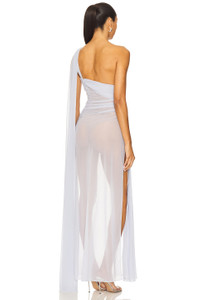 - 100% polyester - Dry clean - Unlined - Pull-on styling - One shoulder design - Lightweight sheer chiffon fabric with draped fabric overlay over shoulder - Garment is intentionally sheer, undergarments will show through - Please note undergarment not included - Revolve Style No. MPAL-WD65 - Manufacturer Style No. MP2466