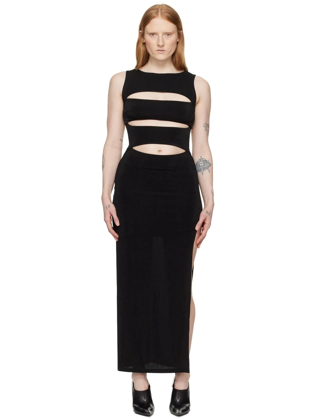 Stretch nylon ribbed jersey dress. · Boat neck · Cutouts at front and back · Vented side seam · Concealed zip closure at back · Partial stretch jersey lining Supplier color: Black Body: 92% polyamide, 8% elastane. Lining: 92% polyester, 8% elastane. Made in Poland 241937F055003