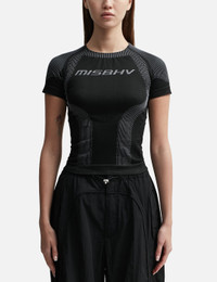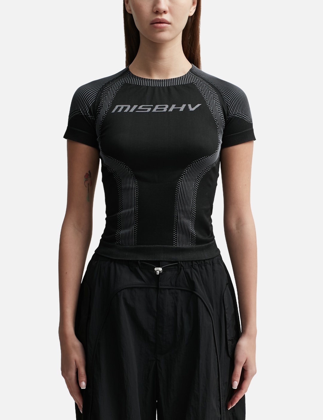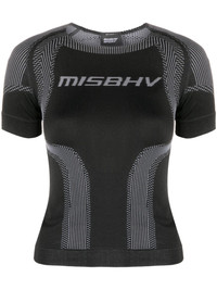 - Misbhv - Sport T-shirt - Stretch nylon fabric - Slim fit - Round neckline - Branding at center - Ribbed trims - Color: Muted Black - Material: 55% Recycled Polyamide, 40% Polyamide, 5% Elastane - See more T-Shirts and Clothing SIZING - Model wears size XS/S - Model measures: Height 175cm, Chest 33”/83.8cm, Waist 23”/58.4cm, Hip 34”/86.4cm