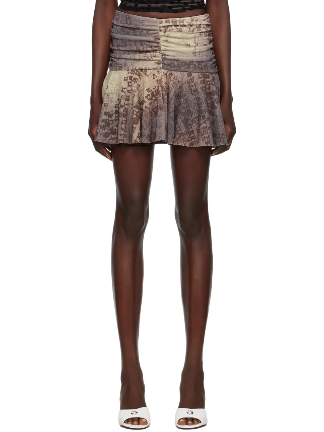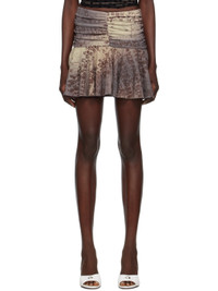 Knit stretch polyester skirt. Pattern printed throughout. · Scalloped lace trim at elasticized waistband · Ruching at front at back · Ruffles at hem · Full mesh lining Supplier color: Brown 95% polyester, 5% elastane. Made in Poland 231937F090008