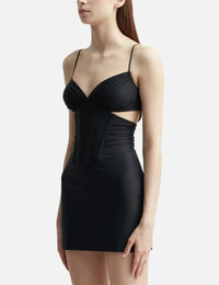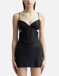 - Misbhv - Corset Mini Dress - Rear zip closure - Thin shoulder straps - Upper corset - Ruffling and decorative cutouts - Color: Black - Material: 76% Polyamide, 24% Elastane - See more Dresses and Clothing SIZING - Model wears size S - Model measures: Height 176cm, Chest 32”/81cm, Waist 23”/59cm,Hip 35”/90cm