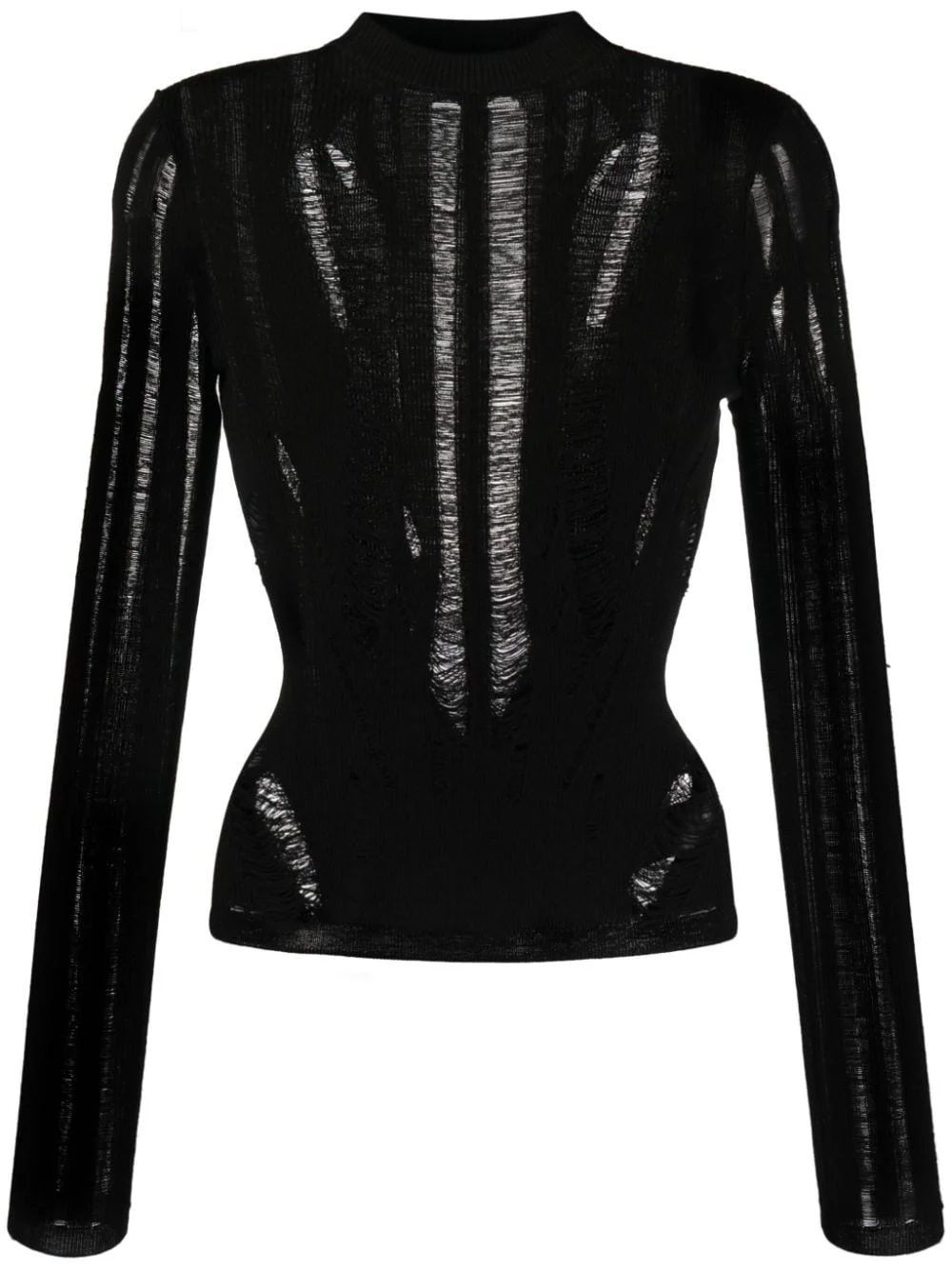 distressed knitted jumper Highlights - Black - Wool-silk blend - Ladder-stitch detailing - Distressed finish - Mock neck - Long sleeves - Straight hem Imported Composition Wool 75%, Silk 25% SIZE & FIT Model measurements Height 5 ft 10 in(1.77 m) Bust/Chest 35.03 in(89 cm) Hips 35.43 in(90 cm) Waist 23.62 in(60 cm) FittingInformation Designed for a close fit throughout Made with a lightweight knit, this piece offers some stretch This piece fits true to size – take your usual size Washing instructions Hand Wash
