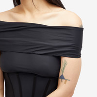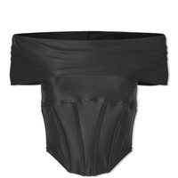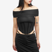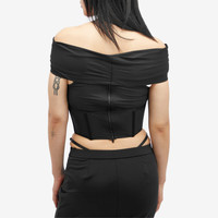 With a knack for mixing the new with a touch of nostalgia, MISBHV brings us the Pandora Off Shoulder Corset Top. It fits like a glove with its structured boning and ruched bardot neckline. This top is just the ticket for any '90s style, belly-bare outfit you have in mind. - 76% Polyamide, 24% Elastane - Back Zip Closure - Boning