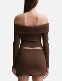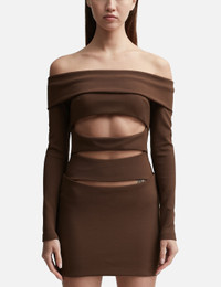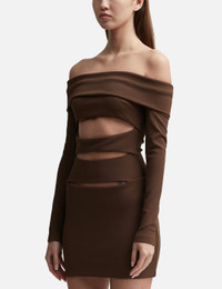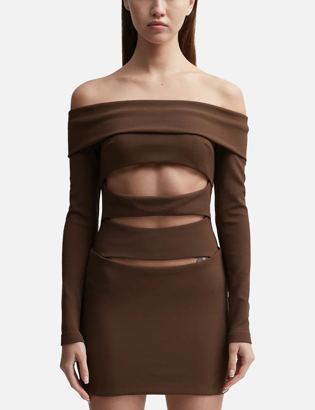 - Misbhv - Elena Off Shoulder Mini Dress - Open shoulder - Cut-out details - Mini-length - Color: Brown - Material: 61% Viscose, 33% Polyamide, 6% Elastane - See more Dresses and Clothing SIZING - Model wears size S - Model measures: Height 175cm, Chest 33”/83.8cm, Waist 23”/58.4cm, Hip 34”/86.4cm