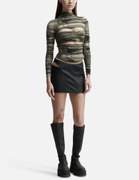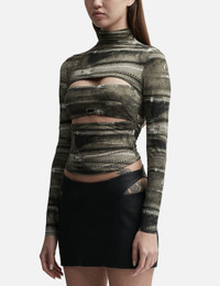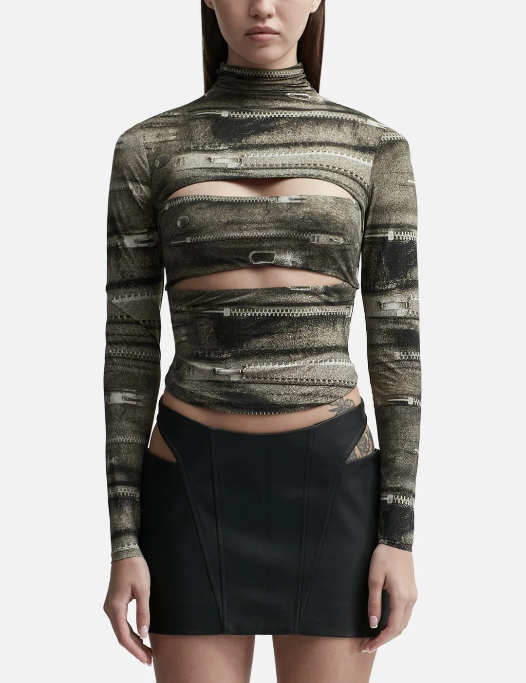 - Misbhv - Elena Zipper Turtleneck Long Sleeve Top - Stretch nylon jersey fabric - Bodycon fit - Turtleneck - Cut-out details at front and rear - Straight hem - Color: Multicolor - Material: 75% Polyamide, 25% Elastane - See more Tops and Clothing SIZING - Model wears size S - Model measures: Height 175cm, Chest 33”/83.8cm, Waist 23”/58.4cm, Hip 34”/86.4cm