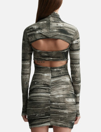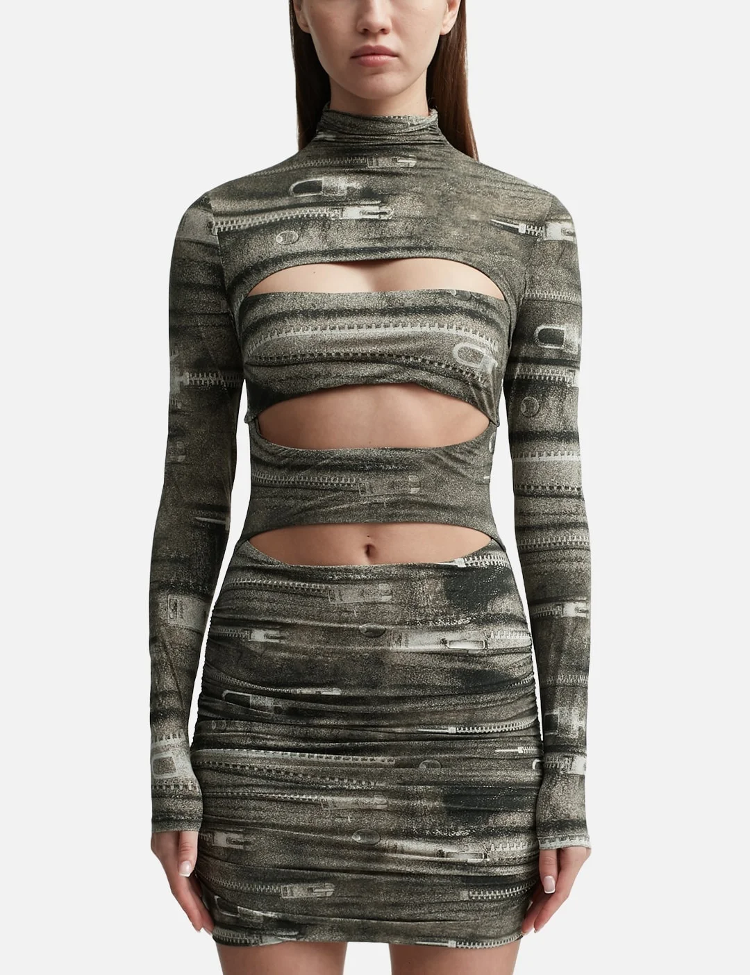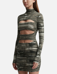 - Misbhv - Elena Zipper Turtleneck Mini Dress - Stretch nylon jersey fabric - Bodycon fit - Turtleneck - Cut-out details - Rear zip closure - Color: Multicolor - Material: 75% Polyamide, 25% Elastane - See more Dresses and Clothing SIZING - Model wears size S - Model measures: Height 175cm, Chest 33”/83.8cm, Waist 23”/58.4cm, Hip 34”/86.4cm
