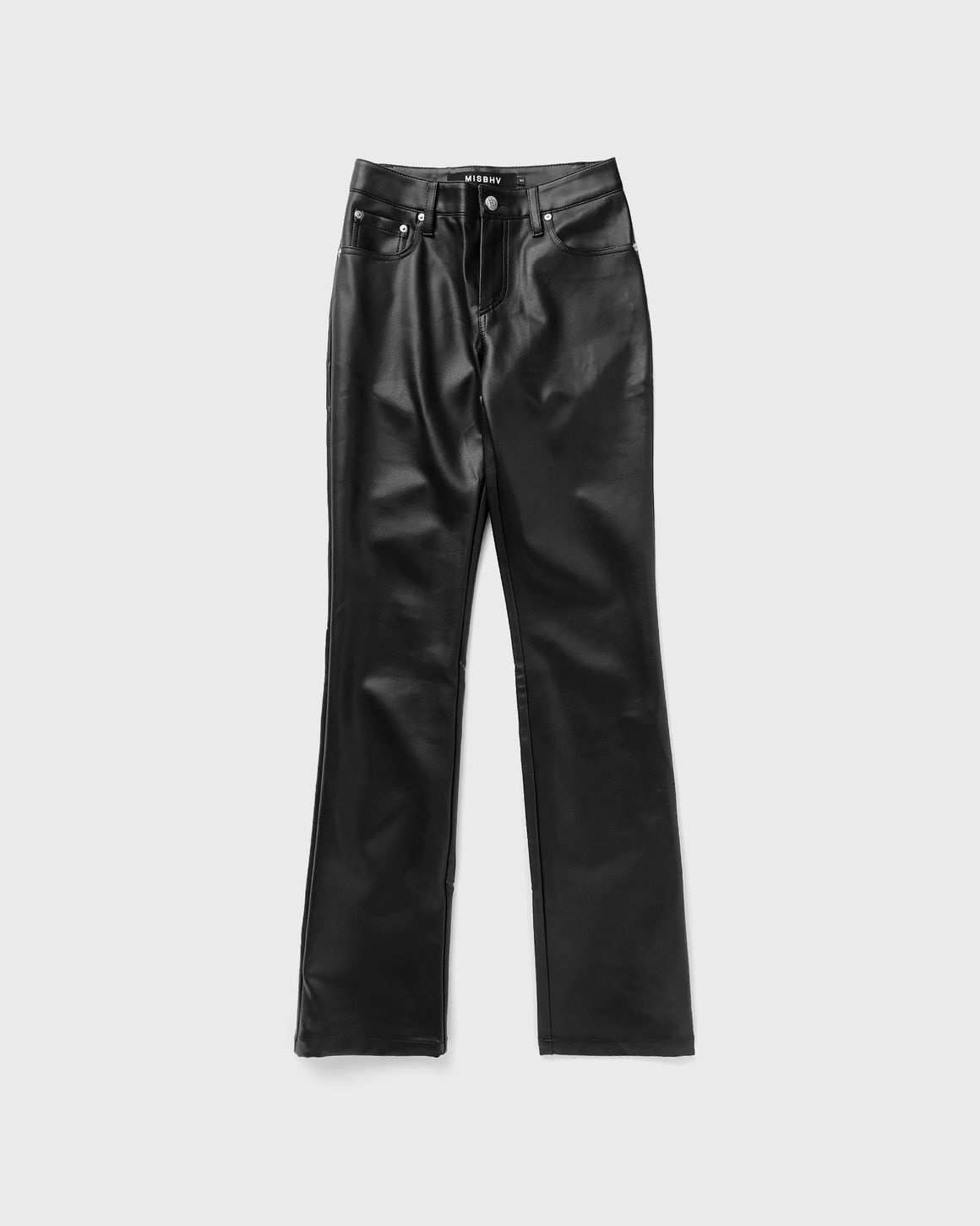 The Vegan Leather Trousers by MISBHV have a straight-leg silhouette and feature belt loops, a zip-fly and logo silver-tone metal hardware. - Straight-leg - Belt loops - Vegan leather Article Number: 122W328 Gender: Women Color: BLACK Material: 55% Polyurethane, 45% Viscose