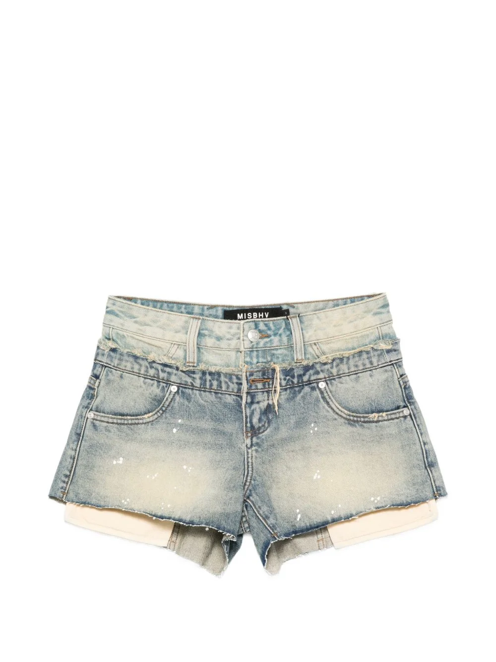 frayed denim shorts Highlights - Blue - Layered design - Frayed hem - Front pockets - Paint splatter detail Imported Composition Cotton 100% Washing instructions Machine Wash