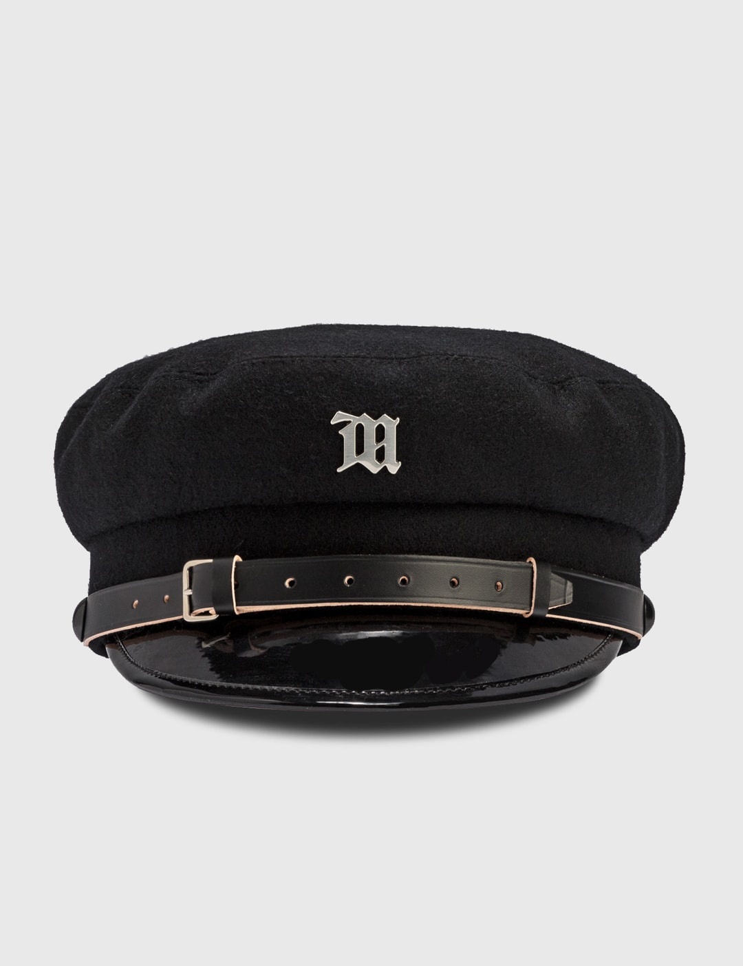 - Misbhv - Monogram Hat - Wool exterior - Front metal logo appliqué - Leather buckle band - Patent leather brim - Color: Black - Material: 100% Wool; 100% Leather - See more Hats and Accessories SIZING Approximate dimensions: - S - Brim Width: 5.5cm - Crown Height: 9cm - Circumference: 54cm - M - Brim Width: 5.5cm - Crown Height: 9cm - Circumference: 56cm - L - Brim Width: 5.5cm - Crown Height: 9cm - Circumference: 58cm