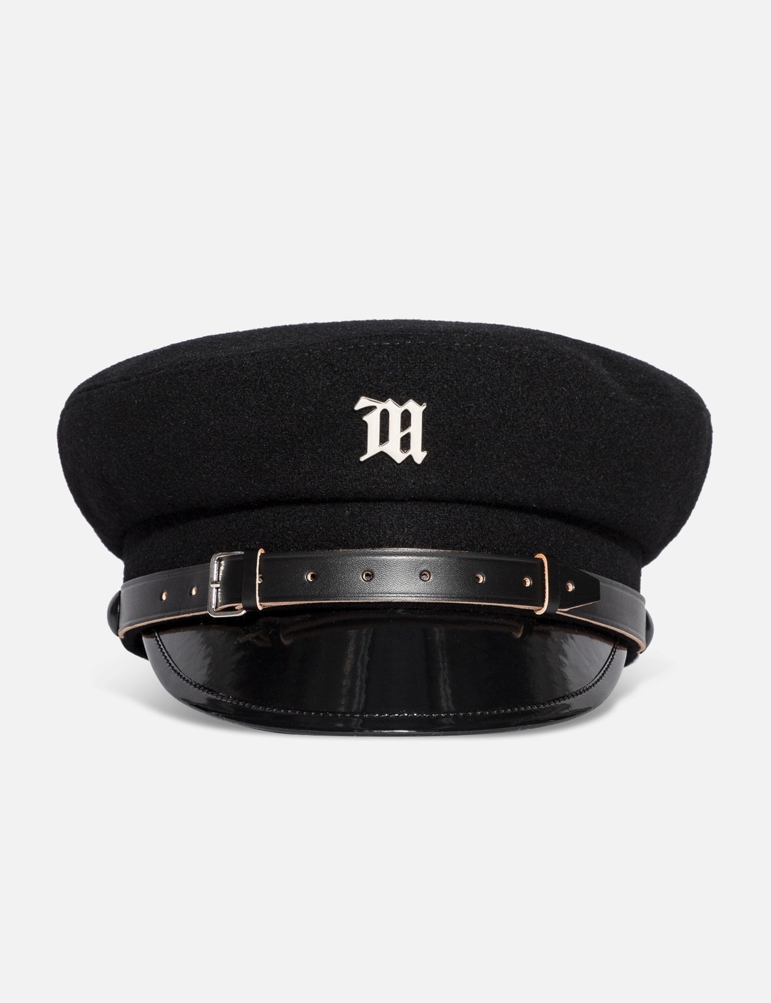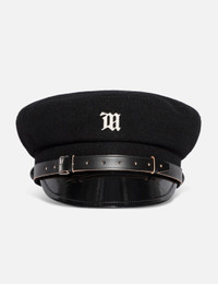 - Misbhv - Monogram Gavroche - Classic black gavroche cap - "M" metal rivet at front - Black lacquered visor - Leather strap with two buckles on rim - Color: Black - Material: 100% Wool - See more Hats and Accessories SIZING Approximate dimensions: - Brim Width: 5cm - Crown Height: 9cm - Circumference: 55cm - Brim Width: 5cm - Crown Height: 9.5cm - Circumference: 56cm - Brim Width: 5.5cm - Crown Height: 9.5cm - Circumference: 59cm